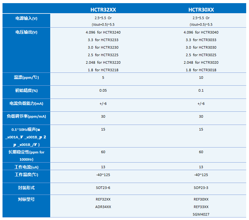 HCTR3XXX为一款高精度、高性价比基准电压源,初始精度为0.1%,其既可用于给 ADC 芯片提供基准电压,也可以给 MCU、ADC、桥式电阻传感器等其他芯片或电路提供恒定的供电,供电电流需在+/-6mA 之内。其供电电压的准确度和噪声相比于 LDO 具有明显优势。